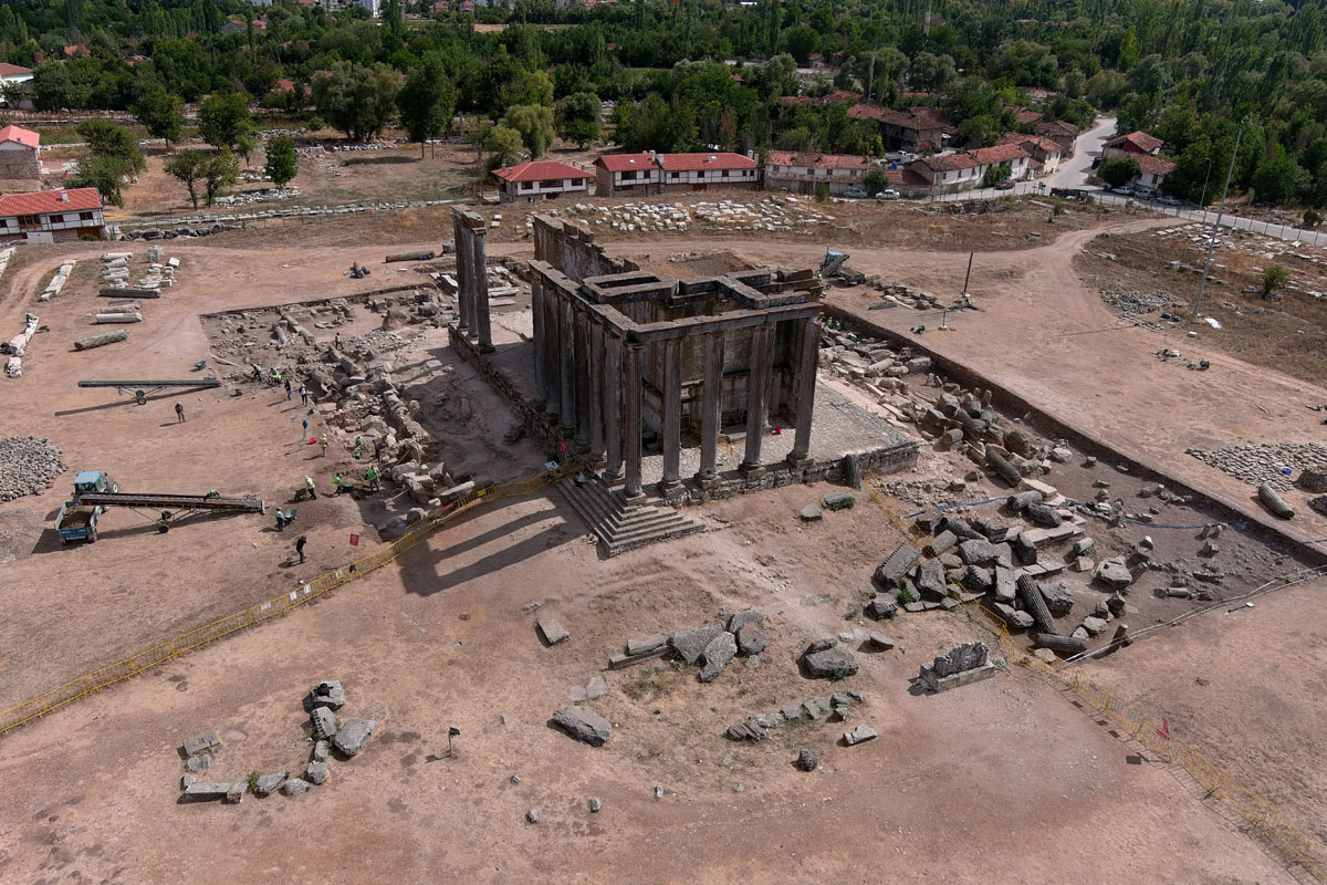 Kütahya’nın Çavdarhisar ilçesinde yer alan ve dünyanın en iyi korunmuş Zeus tapınaklarından birine ev sahipliği yapan Aizanoi Antik Kenti’nde kazı çalışmaları, tapınağın mimari dokusuna dair çarpıcı veriler sunmaya devam ediyor. Roma dönemine tarihlenen bu anıtsal yapının 3 metre yüksekliğindeki podyumu, mermer döşemeleri ve Bizans dönemine ait mezarlar gün yüzüne çıkarıldı.
