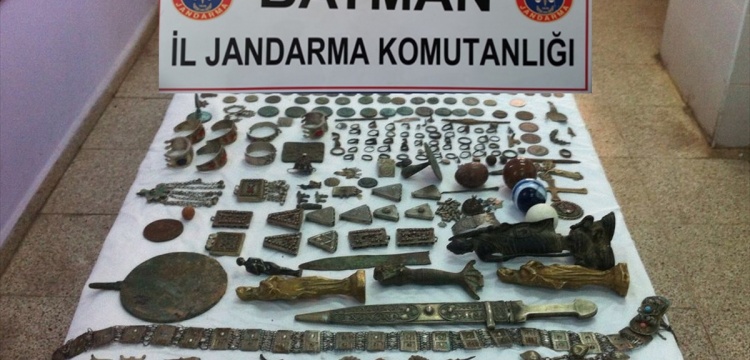 BATMAN: Batman'ın Sason ilçesinde Bizans ve Orta Çağ dönemine ait olduğu belirlenen para, altın, heykel ve eşyadan oluşan bin 771 adet tarihi eser ele geçirildi. Valilikten yapılan açıklamada, bir ihbarı değerlendiren jandarma ekiplerinin Sason ilçesinde bir evde arama yaptığı belirtildi. Bizans ve Orta Çağ dönemine ait olduğu belirtilen 9 heykel, 2 mühür, kabartma heykel, hançer, kemer, 2 haç, 44 kemer parçası, 10 bileklik parçası, 25 kolye ve parçaları, 67 yüzük ve parçaları, 108 eski T.C. kuruş ve liraları, 246 Osmanlı tuğralı para, 20 ok parçasının da yer aldığı para, altın, heykel ve çeşitli eşyalardan oluşan bin 771 adet tarihi eser ele geçirildiği vurgulanan açıklamada, olayla ilgili 1 kişinin de gözaltına alındığı kaydedildi.AA Yılmaz Ekinci