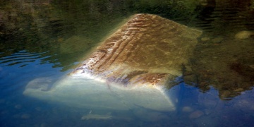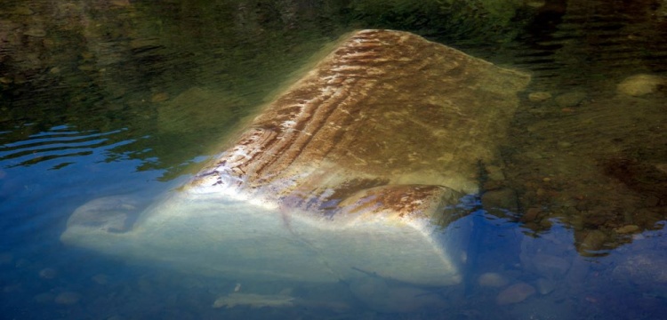 Vatandaşlar tarafından görülen ve bölgede yayın yapan Önder gazetesine gönderilen fotoğrafta dere yatağı içinde bulunan lahit kapağı sular içinde görülüyor.