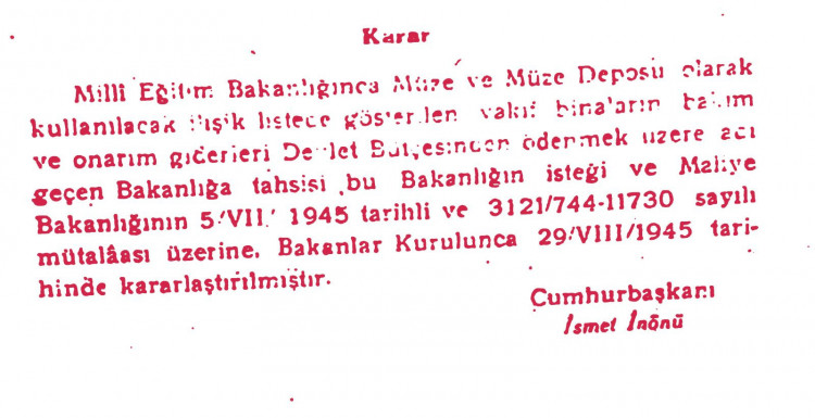 Ortaya çıkarılan belgeye göre; Fatih’teki Fethiye Camii’nin, 1945 yılında resmi gazetede yayınlanmayan bir Bakanlar Kurulu kararı ve Cumhurbaşkanı İsmet İnönü’nün imzasıyla müzeye çevrildiği
