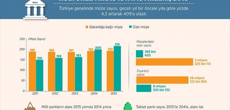 Özel müzelerde mevcut eser sayısı, 2015'te 2014'e göre yüzde 5,1 yükselerek 393 bin 602 oldu. Bu müzelerdeki ziyaretçi sayısı aynı dönemde yüzde 9,8 artarak 8 milyon 925 bin 132'e çıktı.