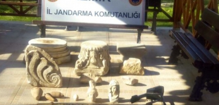 Tarihi eser pazarlamaya çalışan 2 kişi; 6 taş eser, 20 sikke, bir yer ölçüm cihazı, mercek pusula, bir dedektör ve kazı malzemeleri ile yakalandı.