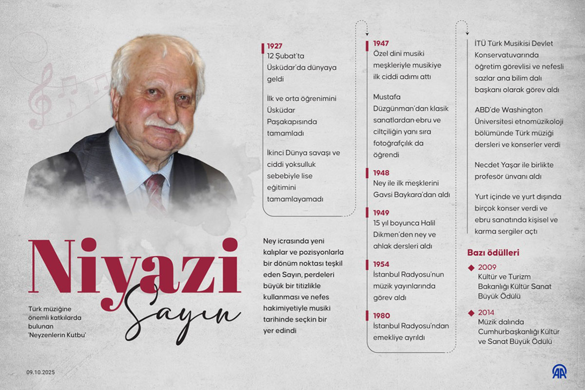 Devlet sanatçısı, neyzen, bestekar, ebru sanatçısı ve fotoğrafçı... Türk mûsikîsinin XX. ve XXI. yüzyıldaki en seçkin temsilcilerinden biri olan Niyazi Sayın, ney icrasına getirdiği estetik, teknik ve ahlâk temelli yaklaşımıyla geleneği yeniden yorumlamış bir sanatkârdır. Meşk silsilesine dayalı eğitimi, akademik kurumlar ve uluslararası platformlarda sürdürdüğü öğreticiliği ile Türk mûsikîsinin aktarımında belirleyici bir rol üstlenmiştir.