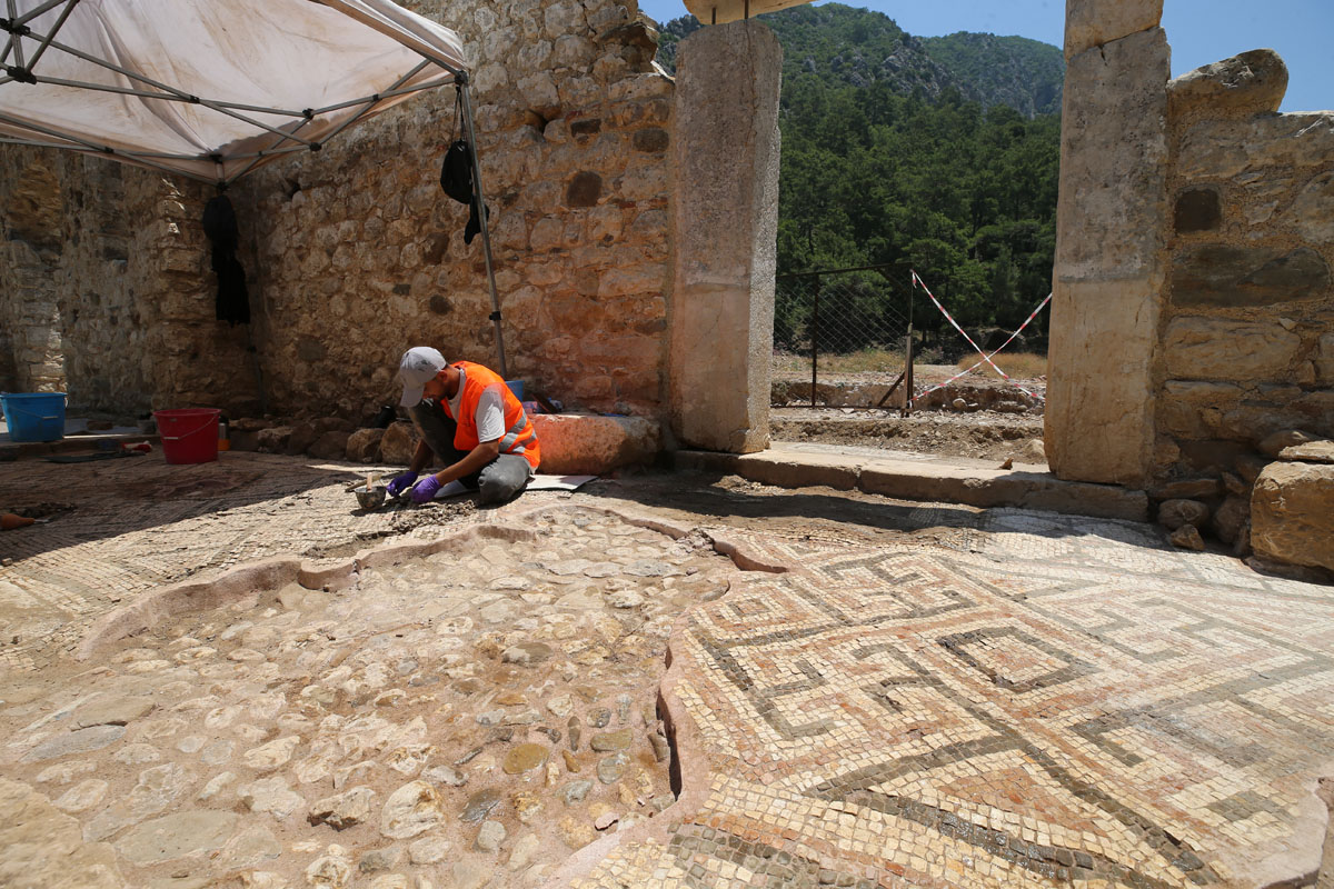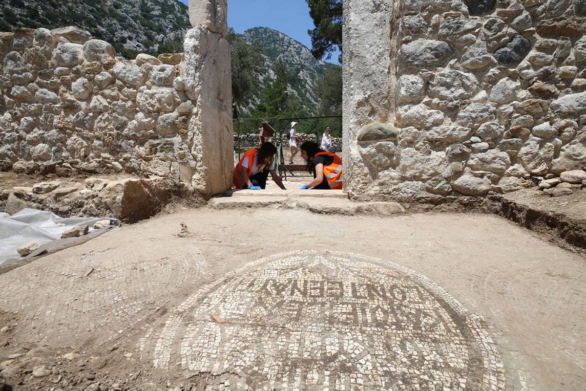 Antalya'nın Kumluca ilçesindeki Olympos Antik Kenti'nde yürütülen çalışmalarda, kilise önünde yazıt ile kilise zemininde yeni mozaik alanları bulundu.