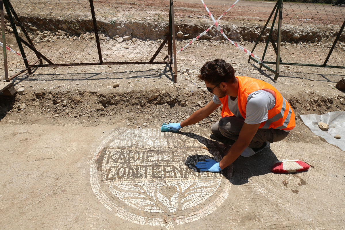Kilisenin hem ek mekanında hem ana mekanındaki mozaiklerde geometri ve bitkisel motiflerin yanı sıra yazıtlarla da karşılaştıklarını anlatan Öztaşkın, yazıtlardan bir tanesinin hemen kilisenin giriş kapısının önünde yer aldığını ifade etti.