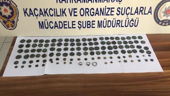 Kahramanmaraş'ta yolcu otobüsündeki yolculardan Y.Z.'nin yanındaki poşette, tarihi eser olarak değerlendirilen Roma ve Bizans dönemine ait görünen 122 sikke ile 3 yüzük ele geçirildi.