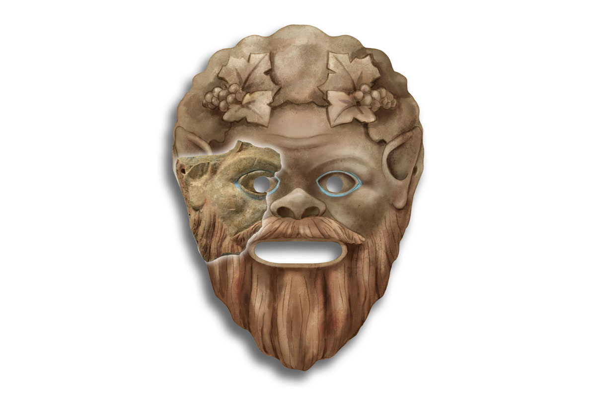 Bulunan maskenin MÖ 2. yüzyıla tarihlendiği bildirildi. Parça, satirin yüzünün sağ tarafını içeriyor: belirgin bir kulak, elmacık kemikleri, oyuk göz bebeği ve yoğun bir sakal dikkat çekiyor. Göz çevresinde mavi kontur ve sakal ile bıyıkta kızıl tonlarının kullanılmış olması, maskenin Yeni Komedi türüne ait olabileceğine işaret ediyor. Kulağın arkasındaki bir delik ise maskeyi oyuncunun başına sabitleyen kayışın bir zamanlar bu noktadan geçtiğini gösteriyor.