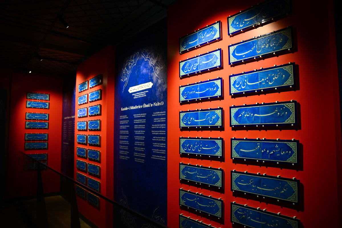 Galerinin dikkat çekici unsurlarından biri, Osman Gazi’den Sultan II. Selim’e kadar Osmanlı sultanlarının isimlerinin 16. yüzyıl çinileri üzerine bir bütün halinde yazılmış olmasıdır. Bu uygulama, çini sanatının yalnızca dekoratif değil, aynı zamanda tarihsel hafızayı taşıyan bir araç olarak da kullanıldığını ortaya koyuyor. Ayrıca 11. yüzyılda Tunuslu şair İbnü’n-Nahvi tarafından kaleme alınan Kaside-i Münferice’den seçilmiş beyitlerin işlendiği çiniler, edebiyat ve görsel sanatlar arasındaki ilişkiyi gözler önüne seriyor.