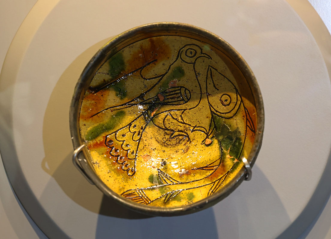 Farklı renkteki bir zemini ortaya çıkarmak için üst yüzeyi kazıyarak dekor oluşturma (sgraffito) tekniğinde yapılan sarı sırlı seramiğin, siyah konturlarla birbirine dönük güvercin ve balık figürleriyle betimlendiği belirlendi.