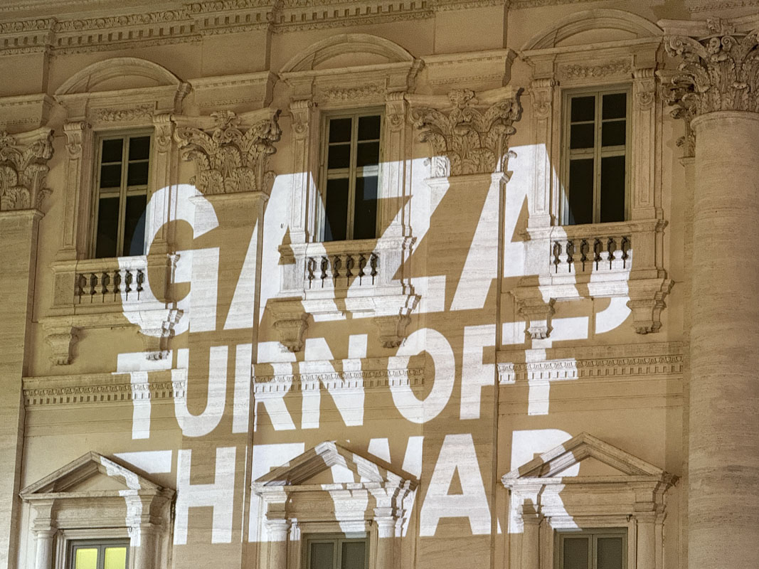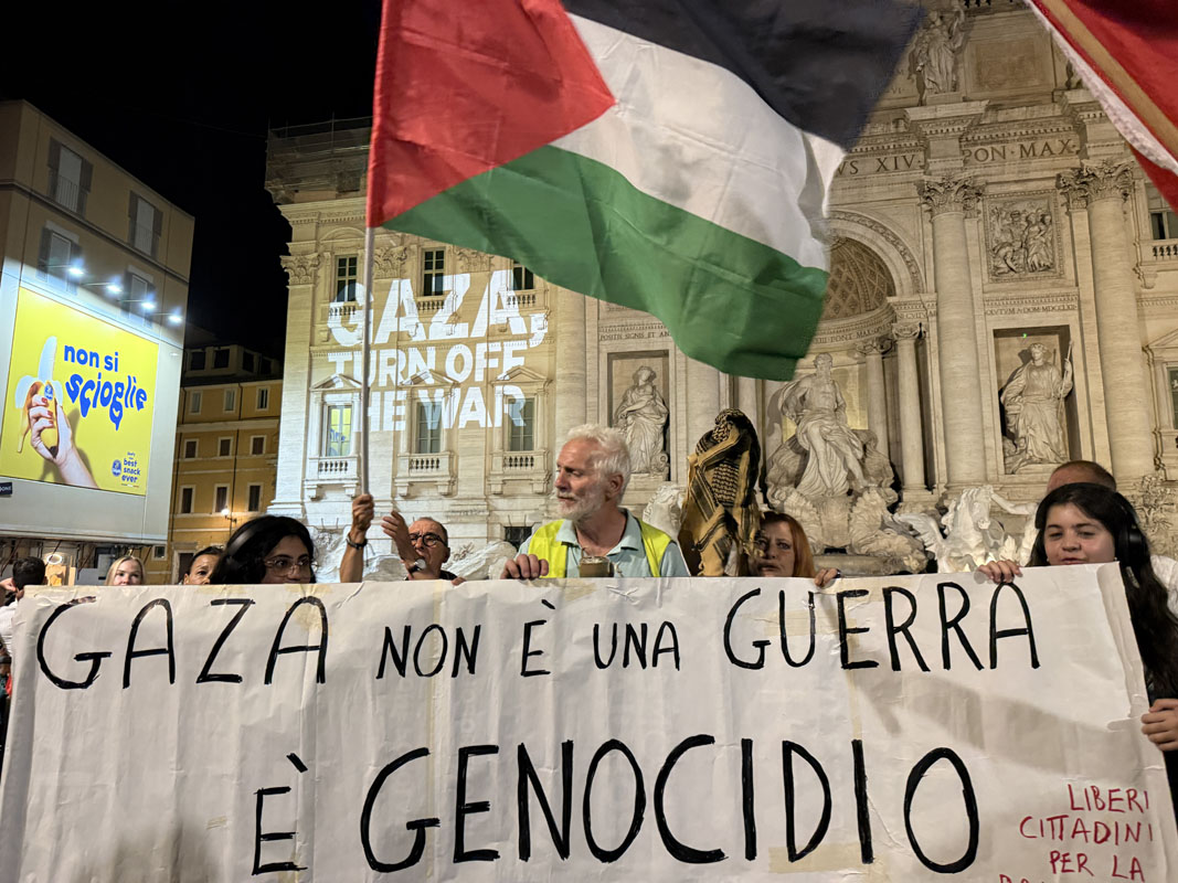 Grup, Roma Belediyesi'nin girişiminde yer alan "Gazze'de savaşı durduralım" yazısına tepkilerini, "Gazze'deki bir savaş değil, bir soykırım" yazılı bir döviz açarak gösterdi.